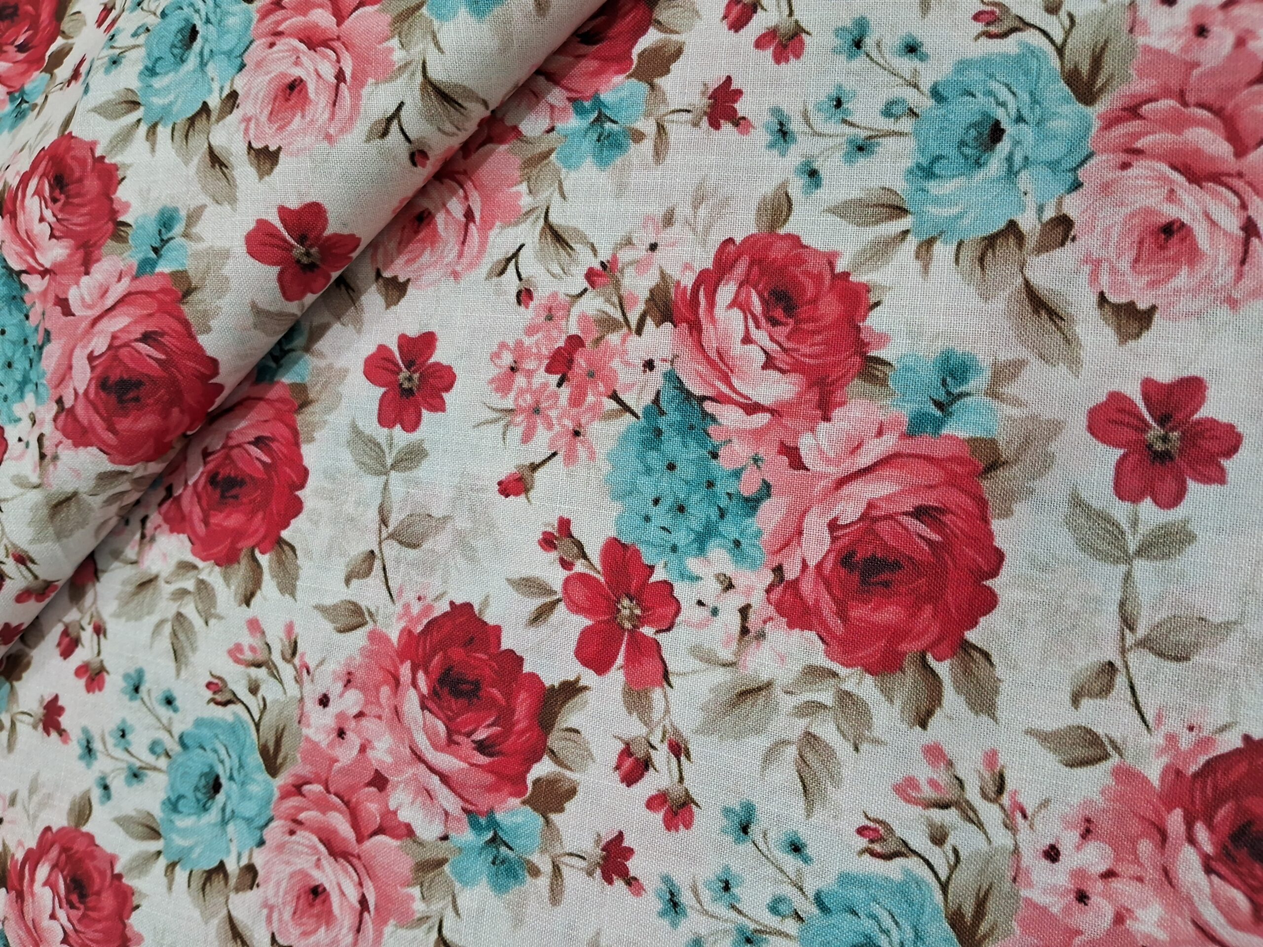 Red & blue rose bunch design digital print cotton blend fabric 36″